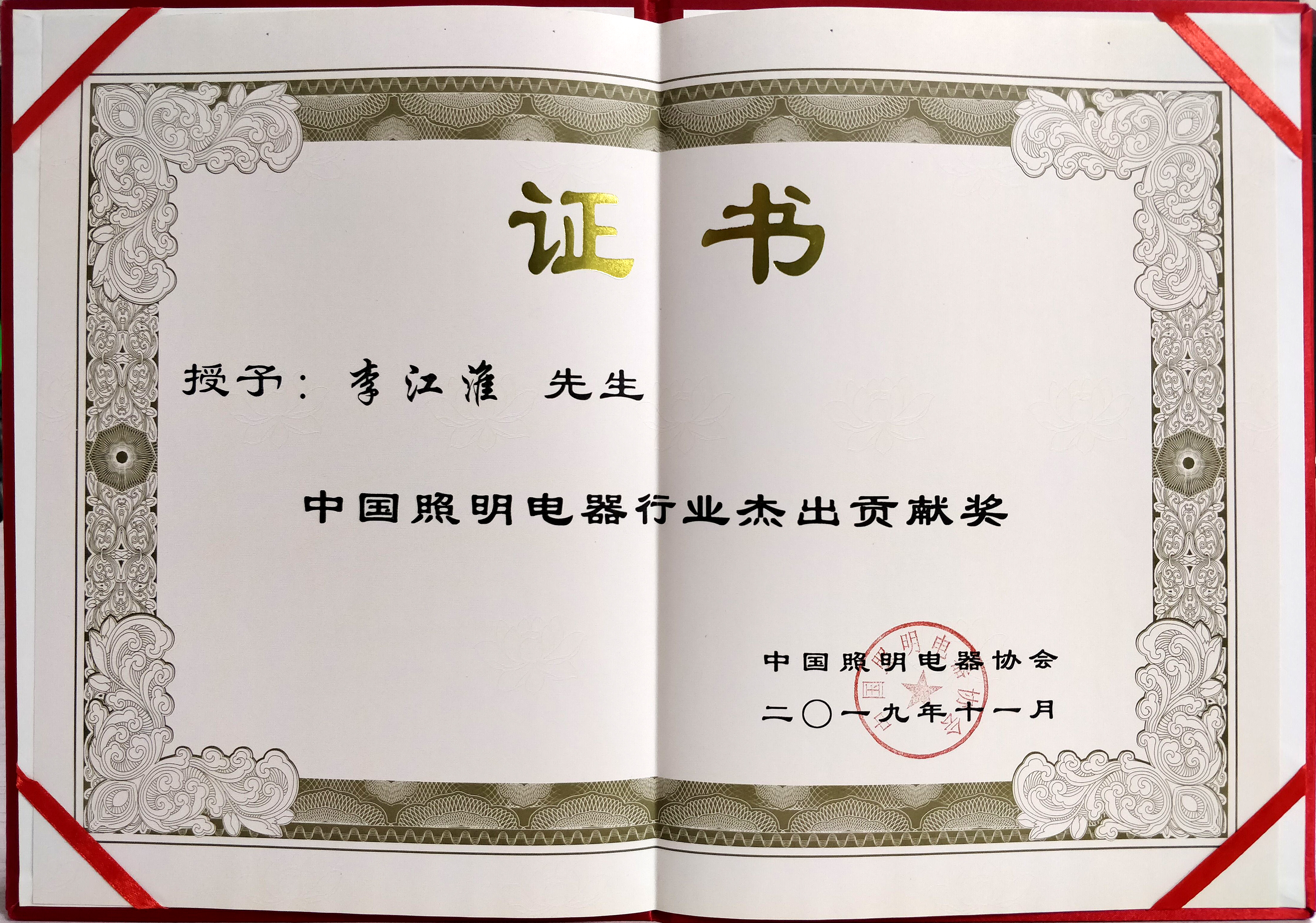 ▲ 董事长李江淮先生荣获“中国照明电器行业杰出贡献奖”