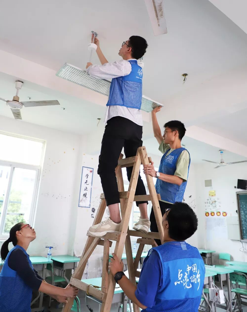 ▲泉水基金会同仁和志愿者为学校安装专业教育照明灯具