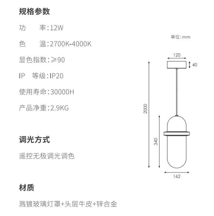 美时吊灯灵感源自早晨的光线,,,穿透云雾渺渺的大气层洒到地上。。。。美时外层的玻璃自上而下从深色到透明的渐变镀层还原了这一情境,,,,光透过双层玻璃形成丰富的折射效果,,,,一如破晓时的光线充满朝气,,,,采用上下两路光组合,,下路光直出提供主要光线,,,上路光提供氛围光。。。上路光在手工吹制玻璃的不规则壁厚折射下,,,,呈现了极其丰富的变化,,,采用头层牛皮作为一个点缀,,,,缓冲了玻璃与金属带来的冰冷和生硬的感觉,,,,取得了视觉的平衡。。。