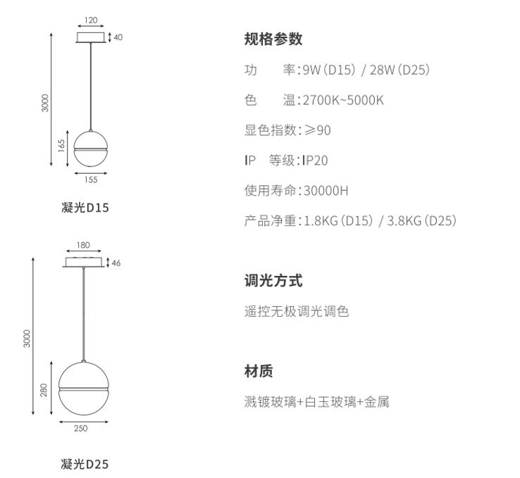 凝光吊灯用双层弯曲的造型作为主要造型特征形成在空间里自由灵动的造型,,,以一定的角度倾斜,,,形成丰富的画面,,半圆形等分的灯罩采用白玉料与透明溅镀两种工艺,,,,下路利用直下式光学提供充足光线,,,,上路则采用测发光方式,,,,发光面透过溅镀的玻璃曲面折射出一个光的倒影。。。。两种方式组合在一起,,,,使其在简单的几何形态中有自己的表达。。